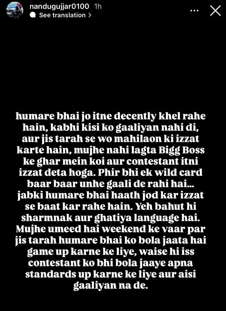 Following the verbal spat, Mridul’s cousin, Nandu Gurjar, took to social media to defend him. Posting an Instagram story, he praised Mridul’s respectful behavior towards women and condemned the wild card contestant Malti for repeatedly hurling abusive language despite Mridul’s polite requests. He expressed hope that during the upcoming Weekend Ka Vaar, malpractices in language and respect would be addressed and raised accordingly.