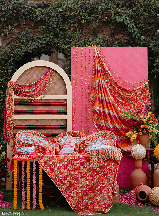 Bright yellows, deep pinks, oranges, and greens lit up the space. Drapes in bold patterns, handmade signs, and festive setups made it feel like a real market stroll. Marigolds, fresh flowers, clay pots, woven baskets, and brass touches added that authentic Punjabi warmth and scent.